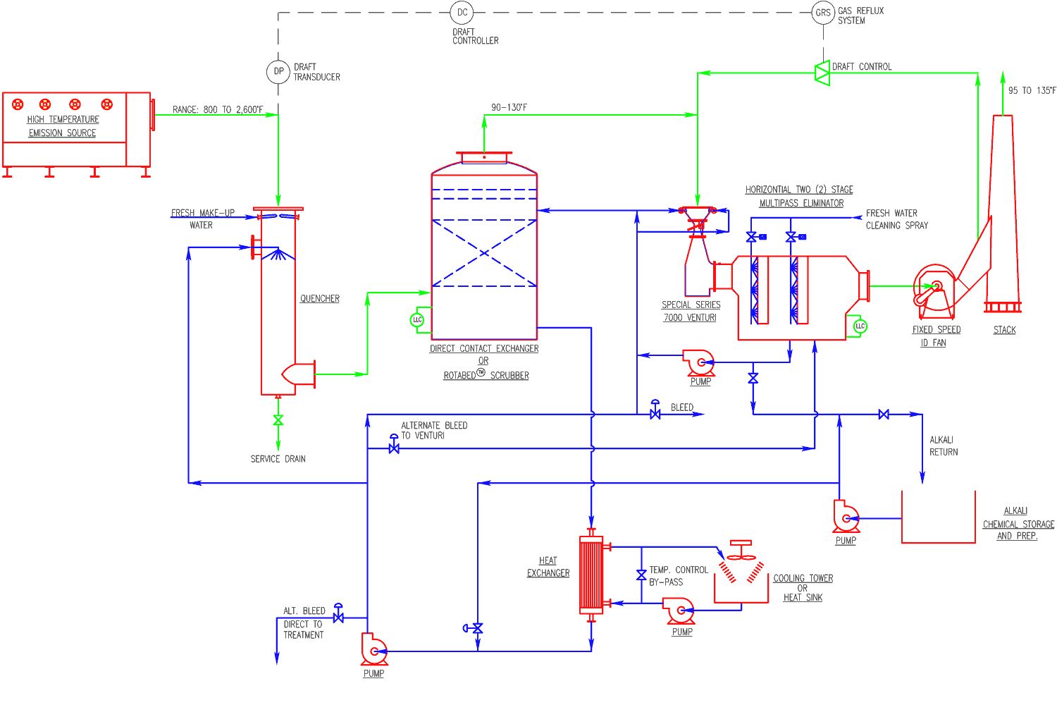 When acid gas control is required an alkali scrubbing solution can be added to the scrubbing liquid on a Ph controlled basis.